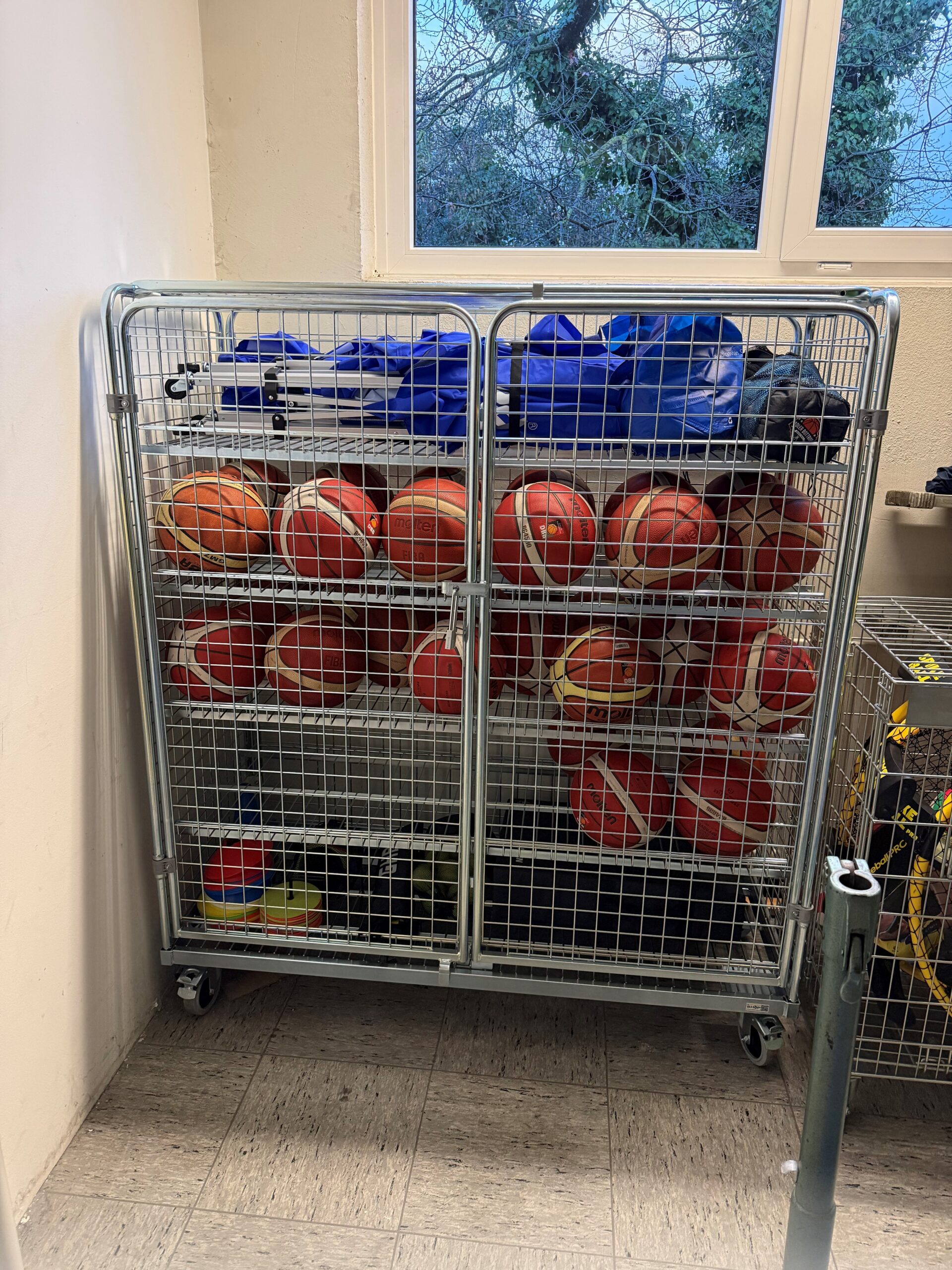 Darin können nun nicht nur sämtliche Bälle sicher gelagert werden, sondern auch weiteres Trainingsmaterial wie die Ballwagen, Leibchen, Agility-Leiter, Trainingsmarker usw. Die sichere und zentrale Aufbewahrung sorgt für Ordnung, schont das Material und erleichtert den Coaches die Organisation!